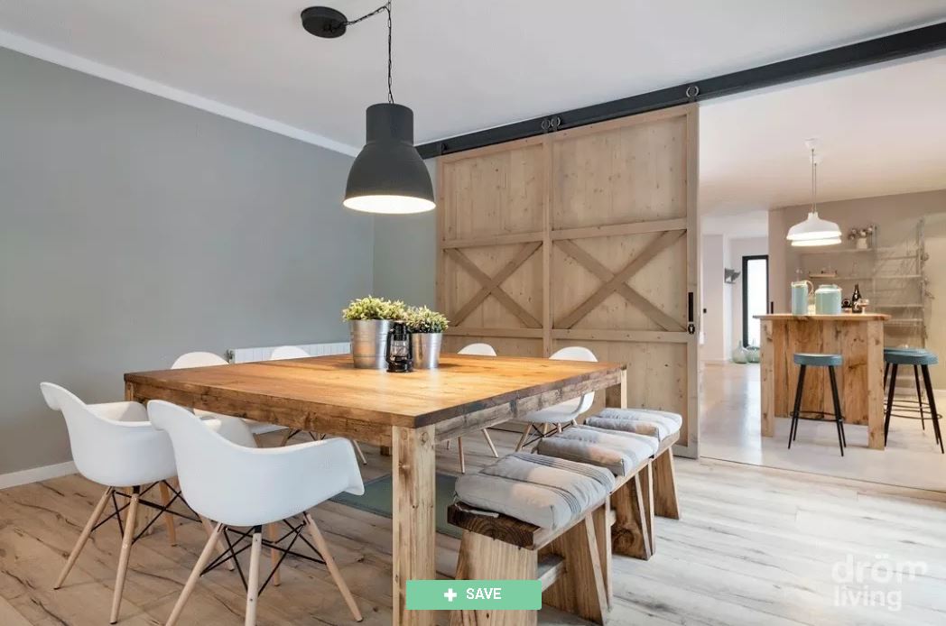 Como ves, la puerta corrediza divide el comedor de la cocina, haciendo de que ambos ambientes estén completamente separados. Cuando sea necesario, las habitaciones podrían integrarse en n parpadeo, con el atractivo de la puerta, la cual es muy decorativa y armoniosa para la decoración rústica de la sala.