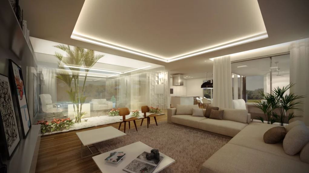 Esta sala está dividida por un hermoso jardín interior hecho de vidrio. Pero no es necesario gastar tanto dinero en un proyecto tan costoso. Una simple pared natural hecha de plantas y arbustos y el trabajo está hecho-dándole a tu espacio un aire orgánico y natural.