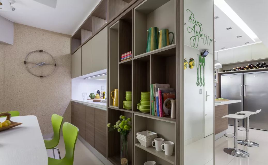 Esta cocina fue dividida entre el refrigerador, isla y mesón, pero las áreas de comedor están juntas. Usando uno de los muebles para colocar la vajilla, el diseñador ha aprovechado todo el espacio disponible.
