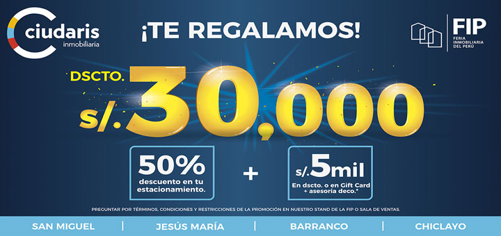 ToggleVuelve la Feria Inmobiliaria del Perú FIP en su segunda versión del año 2017 y Ciudaris Agencia Inmobiliaria participará de este evento como en ediciones anteriores, además brindándote un obsequio de 30.000 Soles en la inicial de tu nuevo depa.